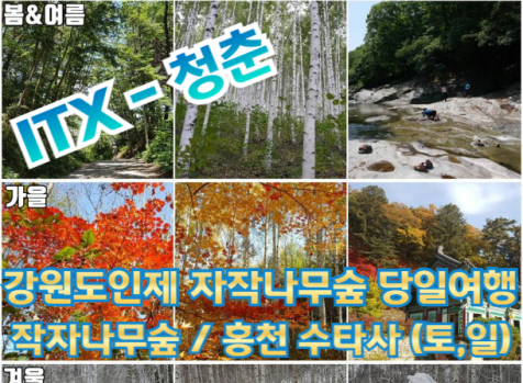 [ 포함내역 ] 열차비, 버스비, 입장료, 중식제공, 가이드비, 알선수수료 [ 불포함내역 ] 제공되는 식사 외 식사비, 개인경비 [ 공지사항 ] ※ 꽃 개화시기 / 단풍 시기 /눈꽃 시기는 신문이나 매스컴,보도자료를 통해 적절하게 판단하시기 바랍니다.. [기상 상황에 따라 변동될 수 있습니다.] [ 참고 및 유의사항 ] *산불 통제 기간 (입산 금지)2025,03,02 ~ 2025,04,30 [ 여행일정 ] DAY 1 2025. 숙소 : X 조식 : X | 중식 : 백반 | 석식 : X공지 사항 안내 *산불 통제 기간 (입산 금지)2025.03.02 ~ 2025.04.30 07:30용산역 3층대합실 여행센터앞 "기차여행" 노란깃발 직원미팅[연합행사 진행 시 진행 주관사 안내]07:51용산역 출발 (토 ,일)*주중 출발 ITX#2005 용산 07:50 출발 08:09청량리역 - ITX 청춘 - 남춘천역 이동청량리역 개별탑승 - 출발 1일~2일 전 좌석번호 안내09:05남춘천역 도착- 연계버스 - 인제이동10:00홍천 수타사 산소길-공작산 생태 숲과 이어져 있어 산책의 명소로 꼽힙니다~-원통보전 앞 작은 돌탑에 있는 동자승을 찾아보세요~ 11:40중식 제공 - 곤드레 돌솥밥 13:00인제 자작나무숲길 트래킹(트래킹준비물 : 등산화, 물, 간식 등 )*인제 자작나무 숲까지는 주차장에서 도보로 편도 1시간 30분 정도 소요됩니다. 당일 본인의 체력에 따라 조절하세요.17:00연계차량 탑승 - 남춘역으로 이동 18:00자유 석식 <추천 메뉴 : 춘천 닭갈비> 19:38남춘천역 출발[대체열차안내]*기차표 상황에 따라 남춘천 20:34분 출발 - 용산 21:52분 도착 열차로 변경 될수 있습니다.평일(월~금)에는 다음과 같이 이용 열차가 변경됩니다.남춘천역 19:42 출발 - 용산역 20:01 도착 20:35청량리 도착20:55용산역 도착※ 상기일정은 아래조건의 경우에 변경될 수 있음을 양지 바랍니다.1. 여행자의 안전과 보호를 위하여 여행자의 요청 또는 현지사정에 의하여 부득이 하다고 쌍방이 합의한 경우2. 천재지변,전란, 정부의 명령, 운송, 숙박기관등의 파업, 휴업등으로 여행의 목정이 달성할 수 없는 경우3. 당사의 고의 또는 과실 없이, 항공기, 기차, 선박등 교통기관의 연발착 또는 교통 체증등으로 인하여계획된 일정 진행이 불가능한 경우4. 현지의 기상사정 및 도로교통 여건에 의하여 일정의 변동이 필요한 경우 [ 안내사항 ]