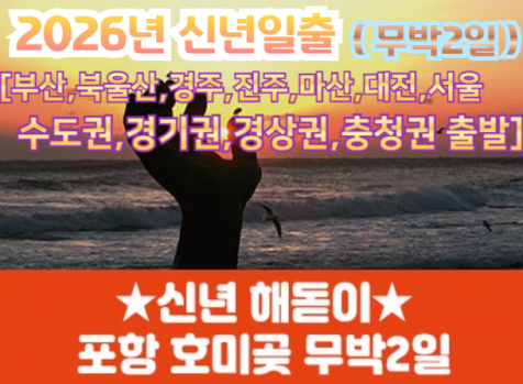 상품코드 9932 [수도권/경기권/충청권/경상권출발] [ 2026년 신년해돋이] 2026년 호미곶 신년해맞이 (무박2일) 12/31출발 -단1회 [부산,북울산,신경주,진주,마산,대전,서울] 출발일 달력에서 출발일을 선택해주세요. 상품가격 136,000원 (대인) 123,000원 (소인) 최소출발인원 20명 기차역별 요금이 상이합니다 마감이 탑승지별 차이가 있습니다 대기예약 가능합니다 전화주세요