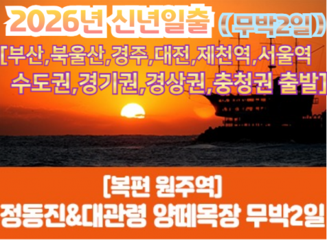상품코드 9936 [수도권/경기권/충청권/경상권출발] [복편 원주역 출발] [ 2026년 신년해돋이] 정동진 신년해맞이/ 양떼목장 횡성한우 무한리필 (무박2일) -12월31일(단1회출발) [부산역,대전역,북울산,경주역,제천역,대전역,수원역,서울역] 출발일 달력에서 출발일을 선택해주세요. 상품가격 189,000원 (대인) 168,000원 (소인) 최소출발인원 20명 .기차역별 요금이 상이합니다 탑승지별 마감이 다릅니다. 대기예약 가능합니다