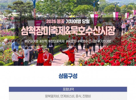 [ 포함내역 ] 왕복열차비,연계차량비, 중식, 진행비 [ 불포함내역 ] 전 일정 식사 포함사항 외 기타개인경비 여행자보험 [ 공지사항 ] 삼척역-삼척장미축제-추암촛대바위&출렁다리-묵호항-동해역 [ 여행일정 ] [ 안내사항 ]